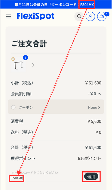 FlexiSpot公式サイトにログインして注文ページで、クーポンコードを入力したあと、適用ボタンを押すだけで使えます。