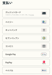 クレジットカード(VISA、MasterCard、American Express、Diners、Discover、JCB)、ペイジー、ネットバンク、コンビニ、GooglePay、PayPay、ペイパル