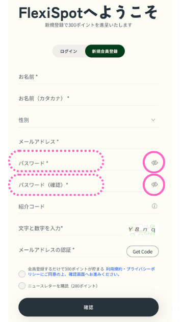 それぞれの項目の右横にある「目のようなマーク」を押して、入力した2つのパスワードが同じか確認してみてください。