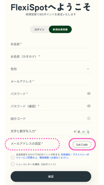 「メールアドレスの認証」項目の右側にある「Get Code」ボタンを押すと、FlexiSpotから「認証番号」が書いているメールが、入力したメールアドレスに届きます。