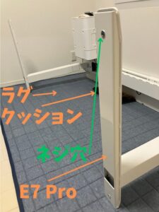 キャスターをつけ終わってE7 Proを起こしやすくするために、天板がラグに当たる部分にクッションも敷きました。